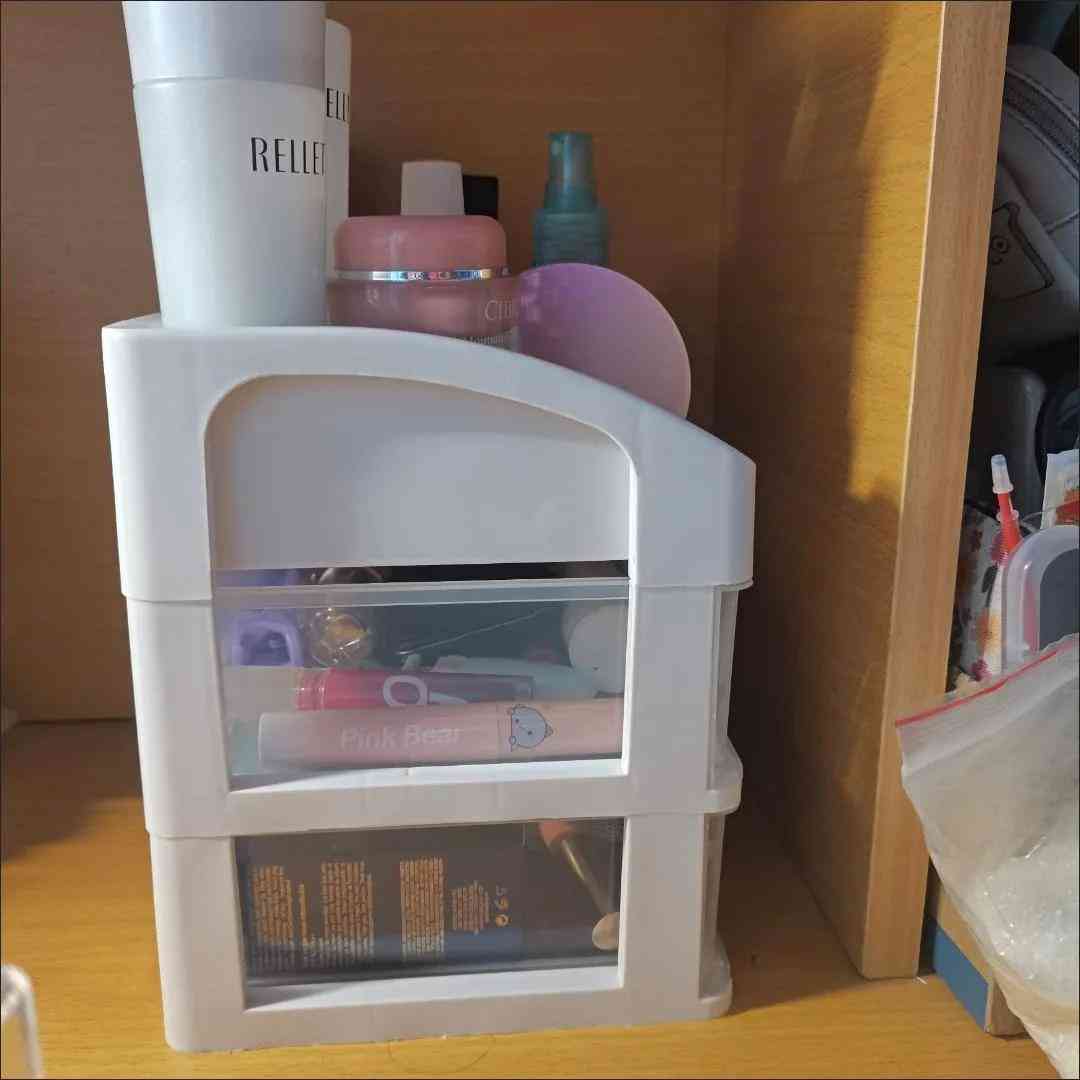 在pdd上买的收纳又便宜又能装,拼夕夕yyds✨一共三层,常用的放在最上面一层,最下面可以放一些唇膏面膜睫毛膏眉笔之类的超级方便的!!平时化妆品太多放的桌子非常乱还好!!在pdd发现这个化妆品收纳盒真的便宜又好用亚克力材质非常好!整理完感觉瞬间有仙气了超级有满足感了。我的平价好物姐妹快冲!