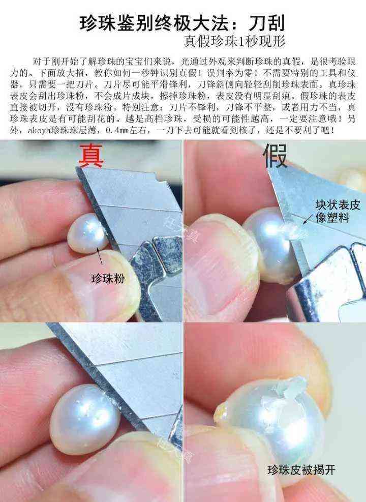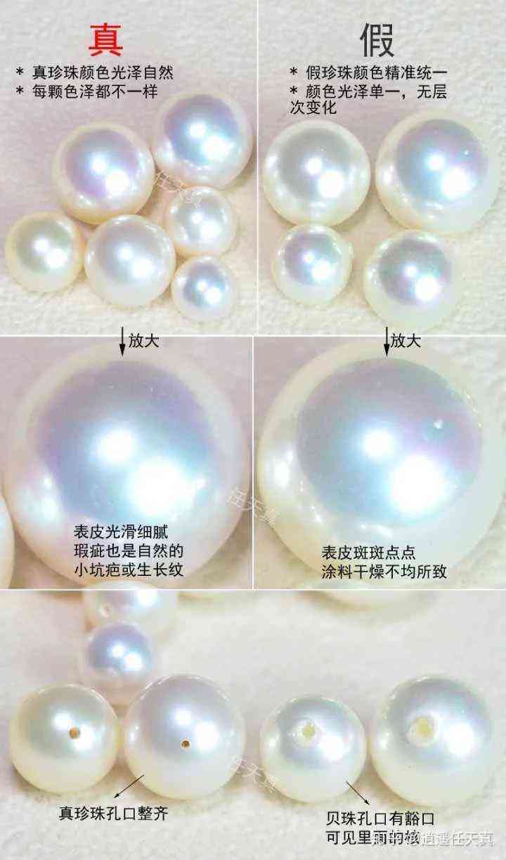 假珍珠比较逼真的,有些可能一眼看不出来,经过一段时间的佩戴,会掉皮,外面一层亮表皮会掉,漏出里面不一样的颜色。