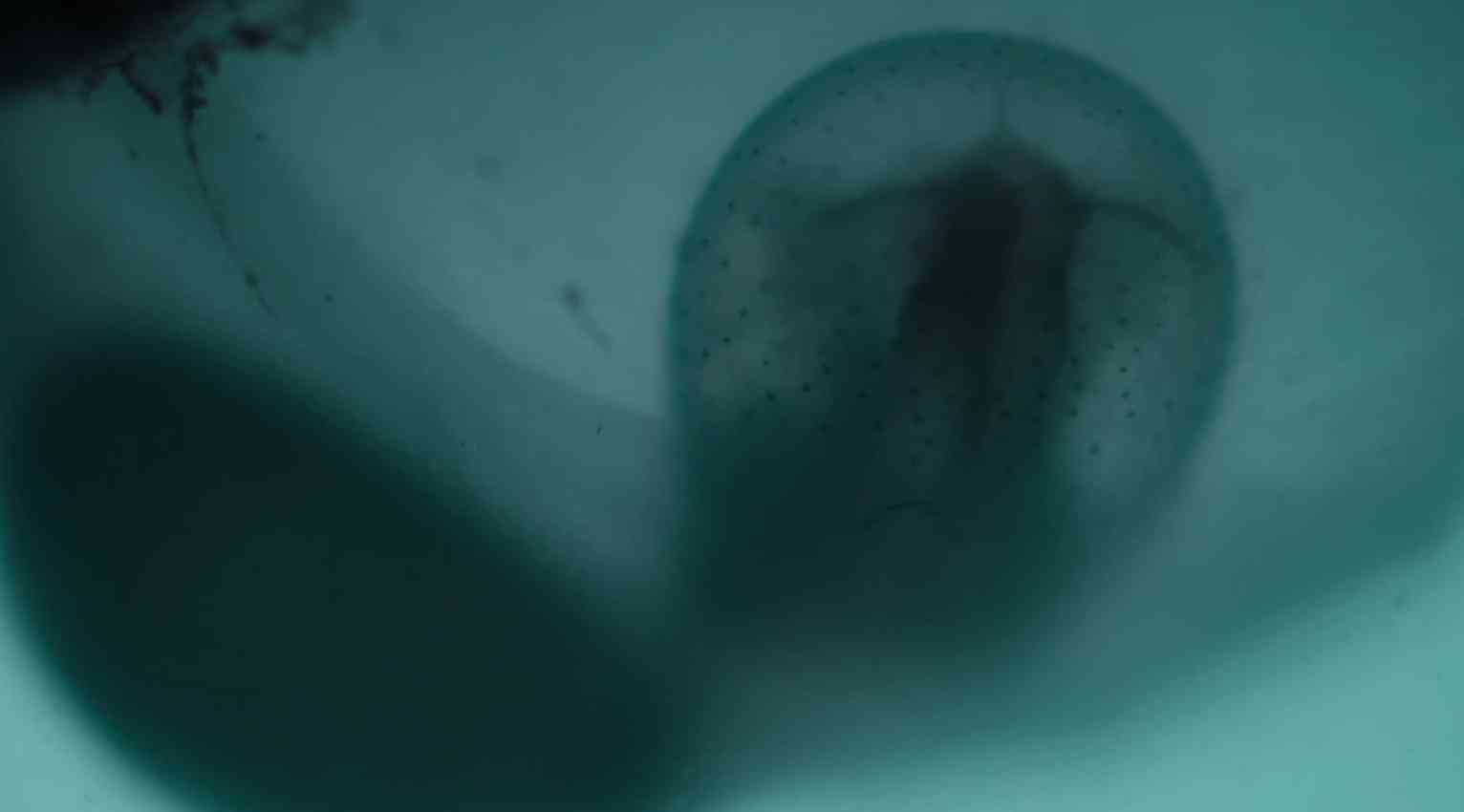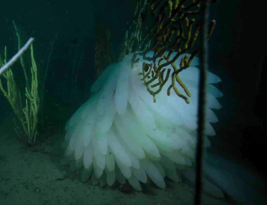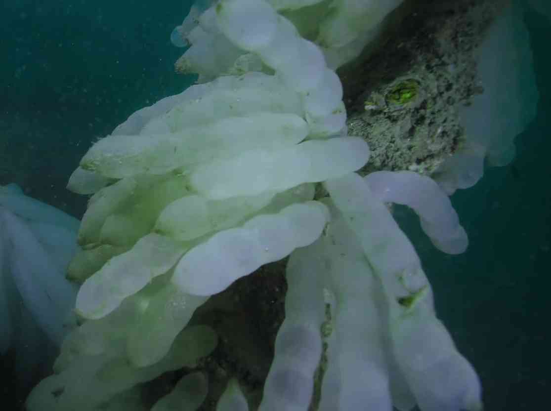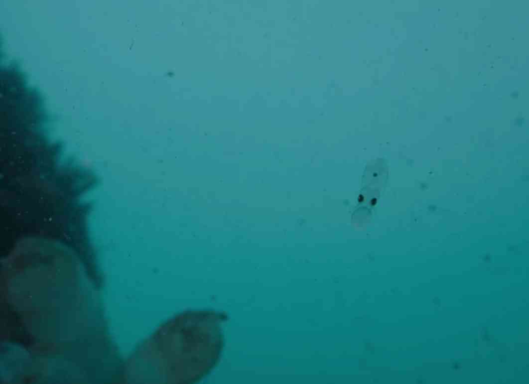 三鳍鳚喜欢在礁区活动,它们体型细小,不超过6cm,有三枚背鳍,故称三鳍鳚。他们的体色与环境相近,不易察觉。可是到了繁殖期,为了吸引配偶,雄性三鳍鳚头部变成黯黑的求偶色,他们在珊瑚礁区域活跃起来,吸引着雌性繁殖交配。接到繁衍指令的还有东山小管,每年立夏时节,它们靠近浅海,繁衍生息。小管,东山本地特色鱿鱼,体型娇小,身披黄点外衣。当地特有的柳珊瑚是东山小管繁殖季节合适的产床。从远处看,摇摆的气球随着波浪拍打,格外引人注目。仔细观察表明,卵鞘基部连接成一条线,悬挂在柳珊瑚的分枝结构上。新卵晶莹剔透,被杆状的卵鞘包裹着,洁白明亮。孕育时间漫长,泥沙渐渐覆上卵鞘。一出大戏已经开演,新生命在这里律动起来。小乌贼隐约出现在水晶球里,渴望尝试。年轻的身体颤抖着撞到了蛋鞘的薄壁上。最后,它冲破了生命的道防线,奔向北纬24度的浩瀚海洋。