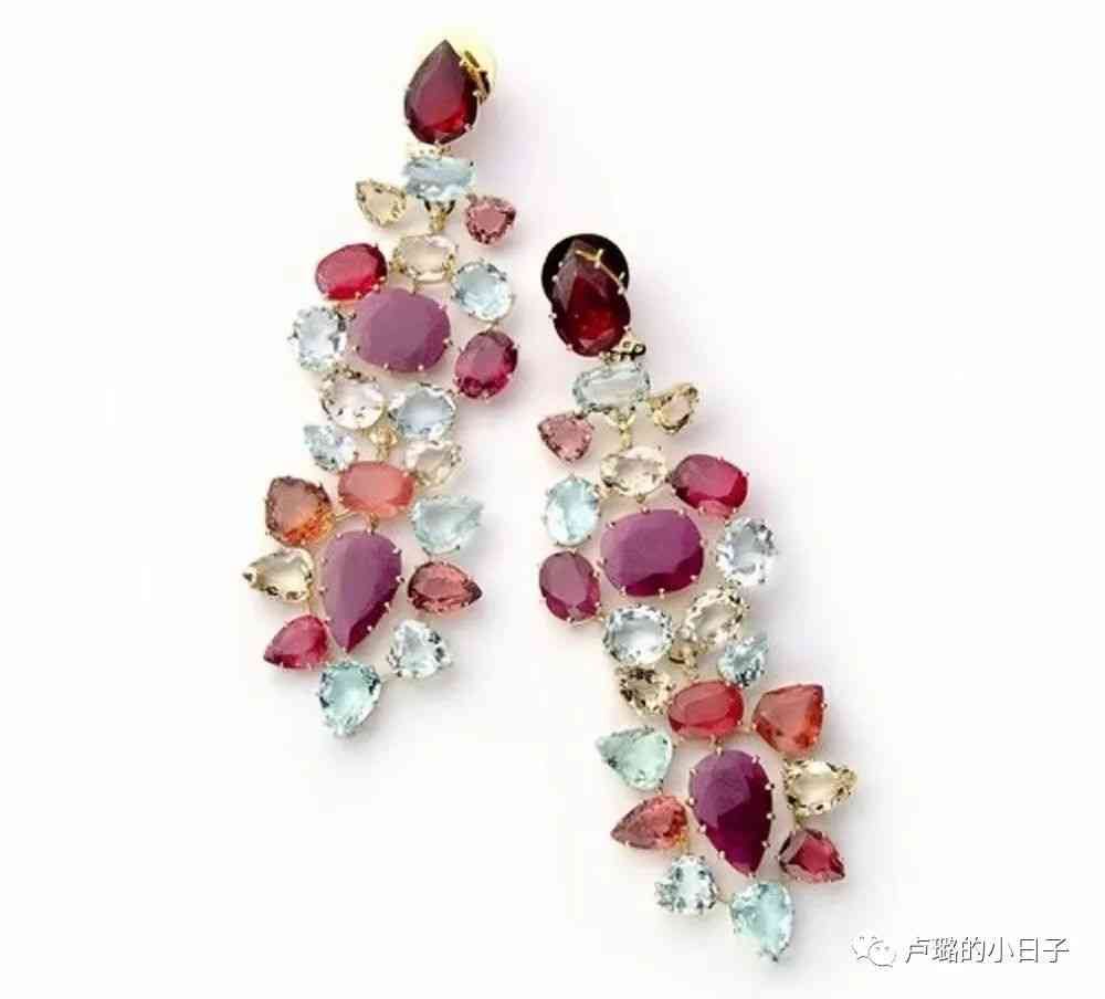 这款耳环用了不少颜色和材质各异的宝石组合而成,有红宝石、黄水晶、绿柱石、粉红色碧玺和钻石。