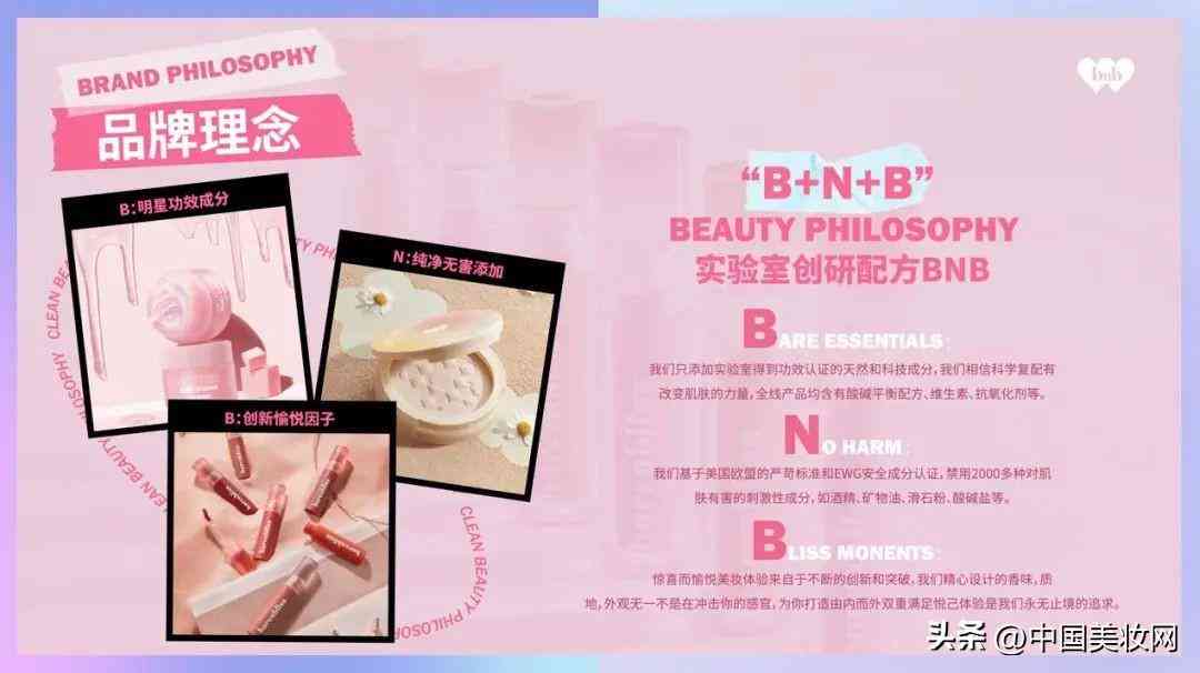 第二个品牌barenbliss,缩写是BNB,它也是有纯净的配方法则的,是“B +N +B” 的实验室配方理念。具体来讲,个B是BARE ESSENTIALS,因为海贝丽致面对的18岁到25岁的年轻人群,他们最大的问题就是痘痘、敏感等,所以针对这些,我们只添加实验室得到功效认证的天然和科技成分,全线产品均含有酸碱平衡配方、维生素、抗氧化剂等。