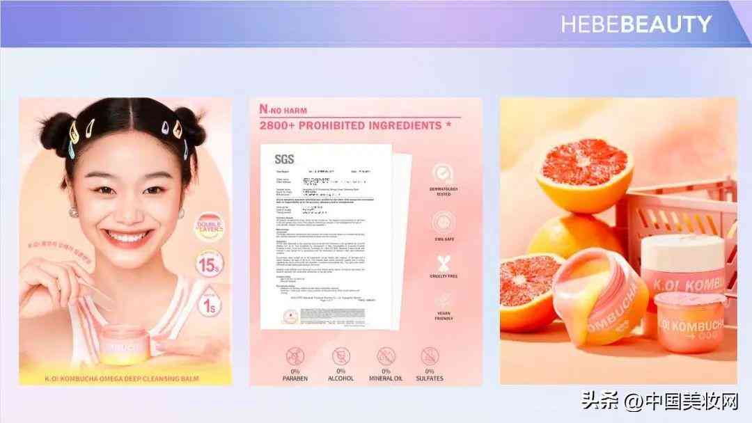 以BNB卸妆膏为例,可以参考下这个单品的详情页,中间是NO HARM解释部分,最上面是2800家的禁用成分清单,这个清单官网上也有公布,所有人都可以查看。下面会摆上SGS 的检测报告,会检查对敏感肌友好、无制痘性这两点;旁边会有几个icon,一是医学检测;二是EWG,证明其安全性;三是动物0残忍;四是素食。