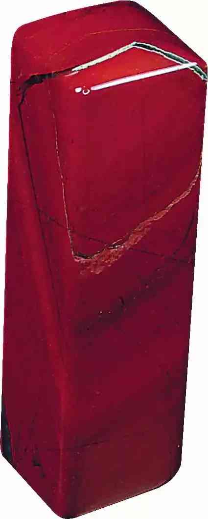 是一种含有赤铁矿的红色微晶质石英。碧玉一般都不透明,贝壳状断口,外表就像红砖,主要产地为印度、美国、俄罗斯、委内瑞拉等国家。一个印章50 ~ 100 元。戴碧玉可以增进血液循环,疏通血气,治疗风湿及关节炎。