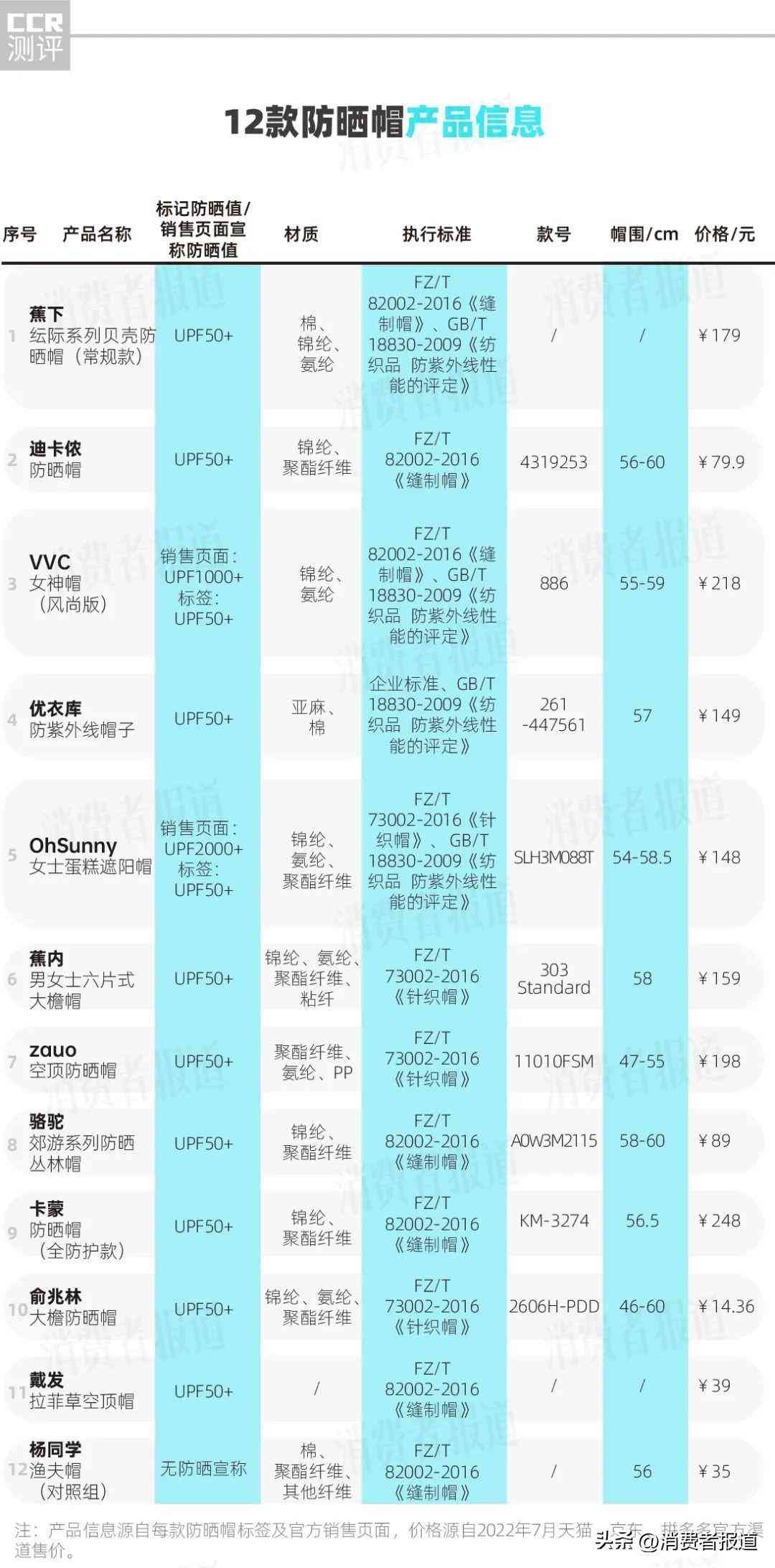 2022年8月,《消费者报道》检测了市面上12款热门防晒帽,有没有你正在戴的呢?
