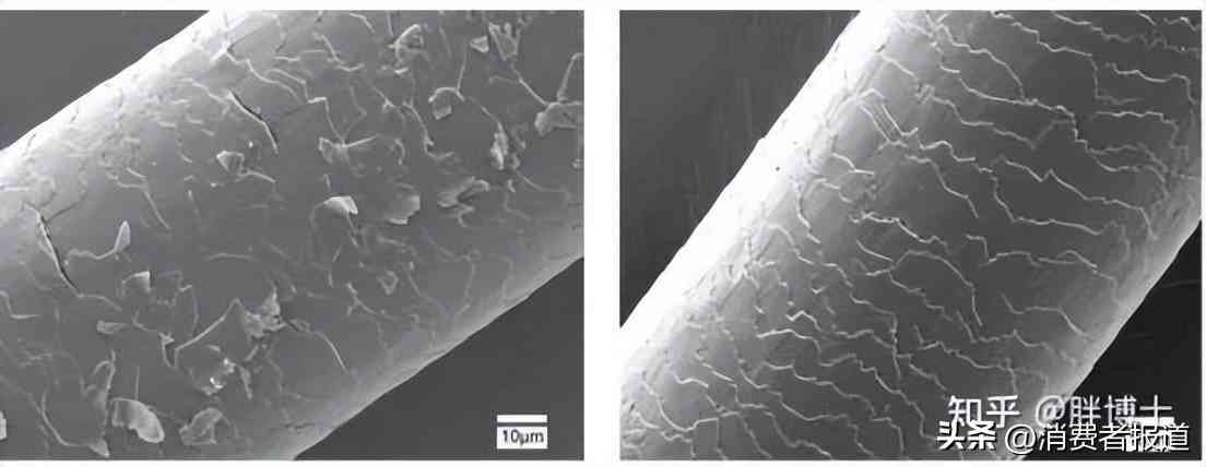 ▲紫外线下受损的毛鳞片(左)和正常的头发对比(右)