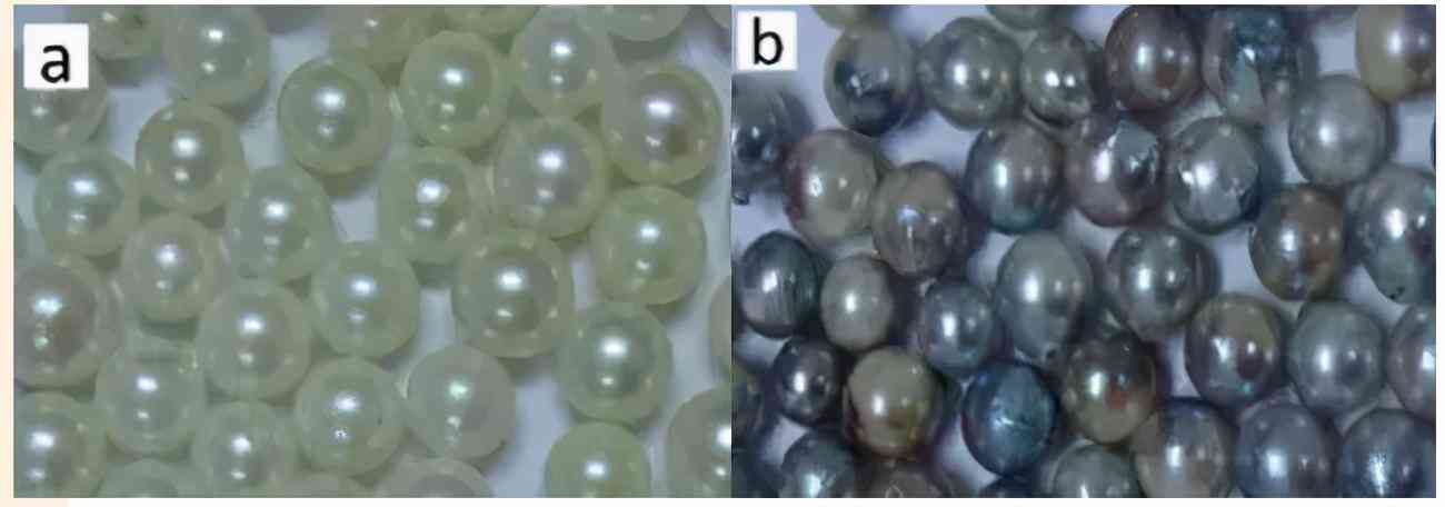 无色珍珠辐照后对比图 ( a:未照射,b:已照射)