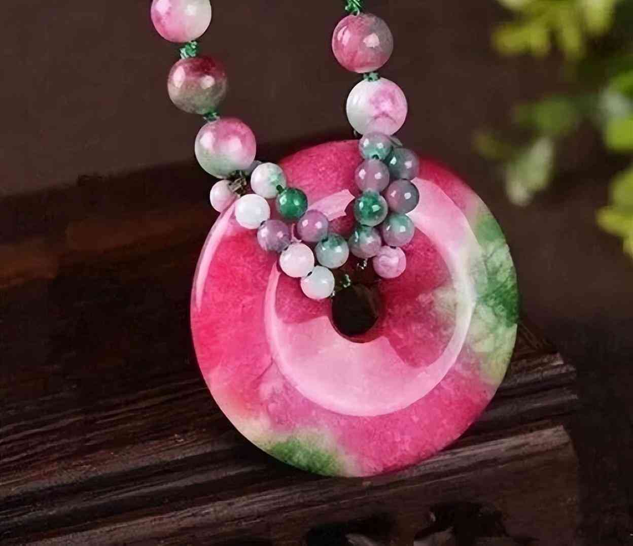 桃花玉质地细腻柔滑,多为艳丽的桃红色,但有时也出现苍翠的青绿色,红若桃花,绿如墨叶,整体相得益彰,给观赏者以很大的美感。