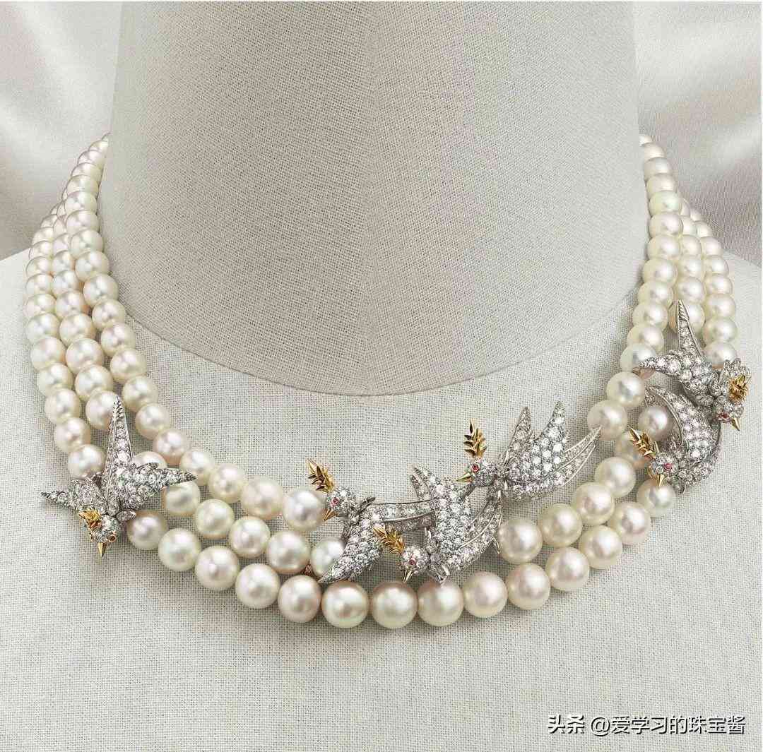 Bird on a Pearl项链则当之无愧成为该系列的瞩目之作。项链为三股设计,珍珠总重逾316克拉,润白天然海水珍珠渐次排列,完美勾勒出优雅曲线之美。 形态各异的小鸟停驻其上,为优雅项链更添一份生动气息。