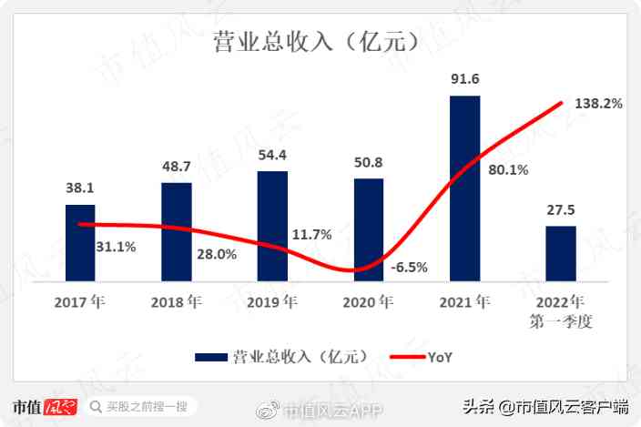 周大生的营业收入在疫情后实现了十分强势的增长,2021年全年营收超过91亿,同比增长约80%。并且这个势头在今年一季度丝毫没有停下来的意思,一季度营收27.5亿,同比增长约138%。
