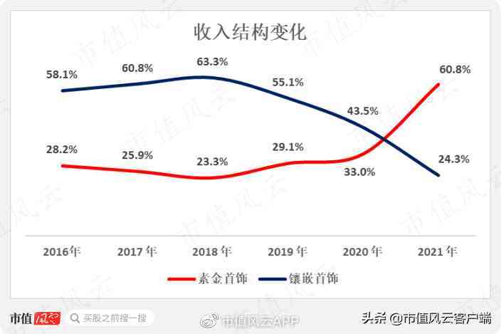 五年来镶嵌首饰一直都是公司最重要的收入来源,到了2021年,这最重要的角色已经变成了素金首饰,占总收入的比重已超过60%。