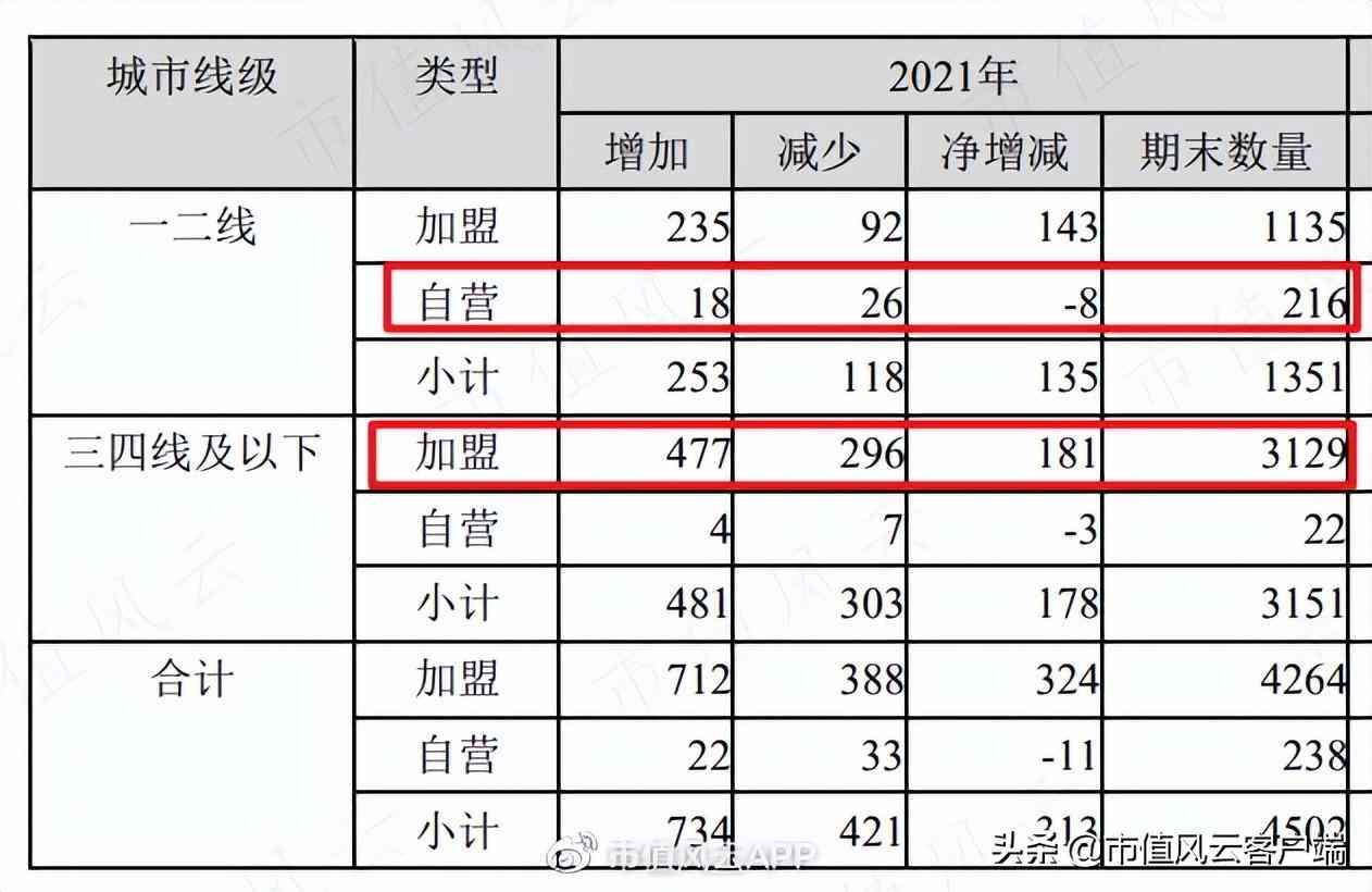 例如2021年末,73%的加盟店都在三四线及以下城市,91%的自营店都位于一二线城市。