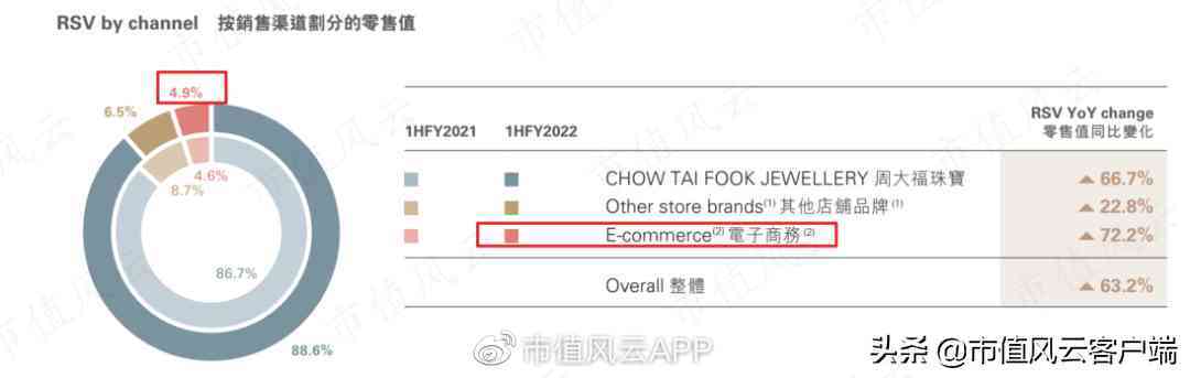 例如周大福在截至2021年9月末的6个月内电商业务占中国大陆收入的比例为4.9%。而周生生的这一数据则为11.1%。很明显周生生的电商化程度高于周大福。