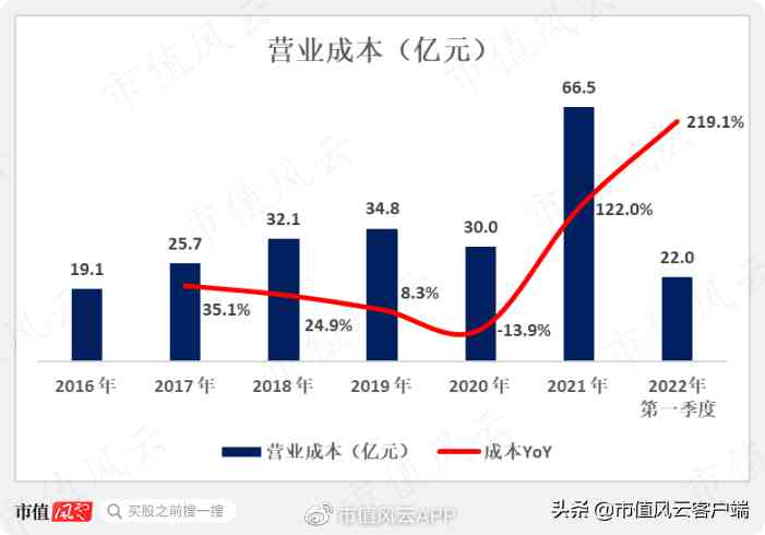 但也不要高兴的太早:公司营业成本在2021年同样迎来了一波暴增,达到66.5亿,同比增长122%。
