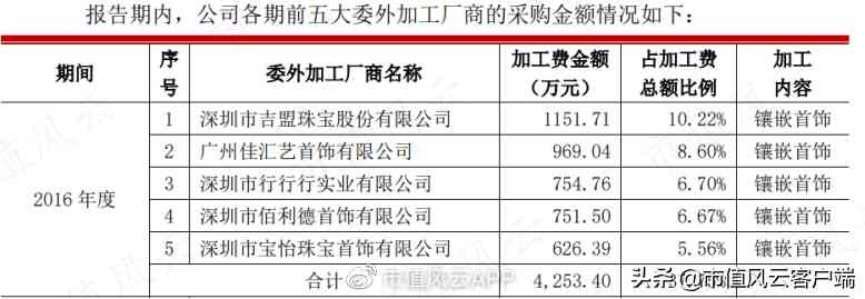 公司自己并不拥有工厂,而是将生产活动外包给专业的珠宝首饰生产商。周大生曾在招股说明书中披露自己的前五大委外加工厂商。