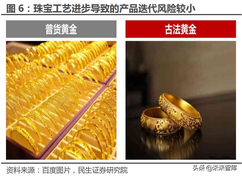 基于价值符号的本质特征,珠宝行业几乎不存在产品迭代风险。对于一般的工 业品或者消费品而言,技术革新往往会迅速淘汰老产品,甚至会直接颠覆某一特定 行业,例如智能手机对功能手机、MP3 的替代,云存储对移动硬盘、U 盘的替代 等等,甚至消费者的需求变化会对某一特定产品的供应链产生巨大影响,比如“全 面屏“手机普及以来,LCD 材质的手机屏幕逐渐被 OLED 所取代。由此可见,尽 管技术进步会不断提升消费者体验,但潜在的产品迭代风险也会对行业格局造成 一定”冲击“。相比之下,这种产品迭代风险在黄金珠宝行业要小得多。由于黄金 珠宝几乎没有任何实际使用价值,所以也就不存在任何功能层面的替代可能,即使 技术工艺出现巨大革新,但带来也仅仅是内部的自我调整,比如古法金出现之后对 普货黄金的替代,此类的产品迭代不会造成行业层面的系统性风险。基于这一点, 我们认为黄金珠宝行业是一个产品迭代风险低、能够长期稳定存在的行业。