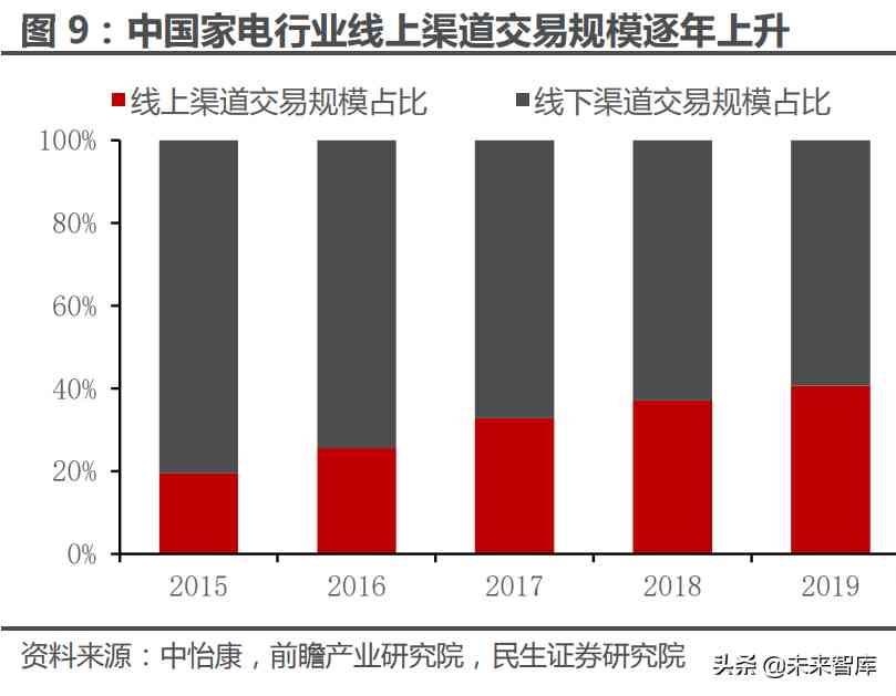 消费者出于对信息不对称的担忧,珠宝行业线下渠道的稳定性并未受到线上 渠道的明显冲击。根据前瞻产业研究院数据,2014-2020 年中国珠宝行业线上渠 道交易规模占比从 2.6%增长至 8.6%,虽然有所提升,但基本没有影响到线下渠 道的主体地位。而在几乎相同的时间区间内,零售板块其它行业却或多或少地受到 线上渠道冲击,比如家电行业的线上渠道交易规模占比从 2015 年的 19.4%快速 增长至 2019 年的 40.6%,期间更有“奥克斯“等长尾品牌借助线上渠道实现崛起 抢占龙头份额。我们认为,线下渠道的存在导致家电等行业产品存在中间环节的冗 余加价,而其往往又无需线下体验,所以电商崛起则迅速消灭了这一信息不对称, 从而诞生渠道红利为长尾品牌提供了扩张机会;相比之下,黄金珠宝的线下体验属 性更强,消费者需要看到实物以判断与自身需求是否匹配,同时由于珠宝单位价值 量较高且易于造假,消费者对于线上渠道的信任感天然偏低,因此珠宝行业以线下 渠道为主的业态得以长期维持,这也为品牌提供了较为平稳的经营环境。