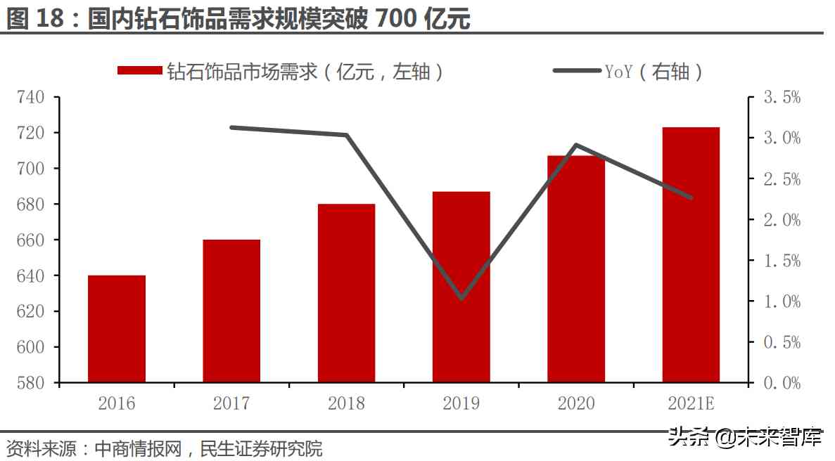 除黄金之外,国内钻石、彩色宝石及玉石等产品呈现百花齐放态势。据中商情 报网数据,2016-2020 年国内钻石饰品市场需求由 640 亿元稳定增长至 707 亿 元,预计 2021 年将达到 723 亿元;据灼识咨询数据,预计 2021 年国内彩色宝石 首饰市场规模有望达到 487.4 亿元;据产业信息网数据,预计 2020 年国内玉石市 场容量达到 642 亿元。可以看出,国内的珠宝市场除黄金之外,钻石、彩色宝石 以及玉石等产品也具备可观的市场规模,并且均保持稳定增长的态势。我们认为, 品类百花齐放的态势体现出国内消费者的多元化需求,品类丰富度的增加也有利 于在一定程度上熨平黄金导致的行业需求周期性波动。