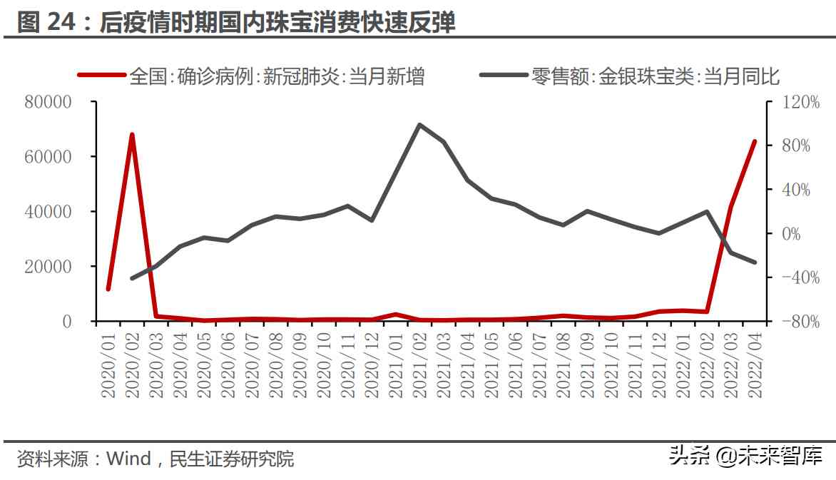 2020 年新冠疫情爆发,大量居民婚庆被迫推后,但婚庆刚需属性较强, 所以 2020 年消费需求同比大幅下降-27.5%之后,于 2021 年同比上升 +45.0%;对比之下,在相同的时间区间内,新冠疫情、国际地缘冲突、 美联储出台货币宽松政策之后又数次释放加息预期的信号等多方因素共 同对金价施加影响,尽管利好多于利空,但整体并不强烈,所以 2020 年 金价小幅上涨之后再度进入震荡区间,对投资需求的拉动比较温和。在这 一阶段,国内珠宝行业的周期主要由黄金消费需求主导。(报告来源:未来智库)