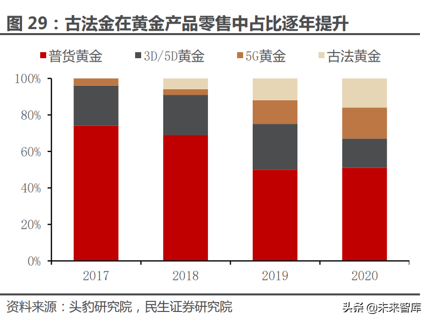 头部品牌加快推出古法金新品,产品结构优化驱动行业实现高增长。古法金由 周大福率先推出,由于具备克重足、外观古色古香并融入更多文化元素等优势,所 以受到消费者的广泛欢迎。据头豹研究院数据,2018-2020 年古法金在黄金产品 零售中的占比由 6%左右快速提升至 16%左右;2021 年以来,周大生推出“非凡 金”系列,老凤祥推出“藏宝金”系列,均为古法金产品,头部品牌在新品类上的 持续发力进一步推动了古法金渗透率的提升,考虑到古法金产品单位价值量显著 高于普货黄金,所以行业产品结构改善成为规模高增长的驱动因素之一。