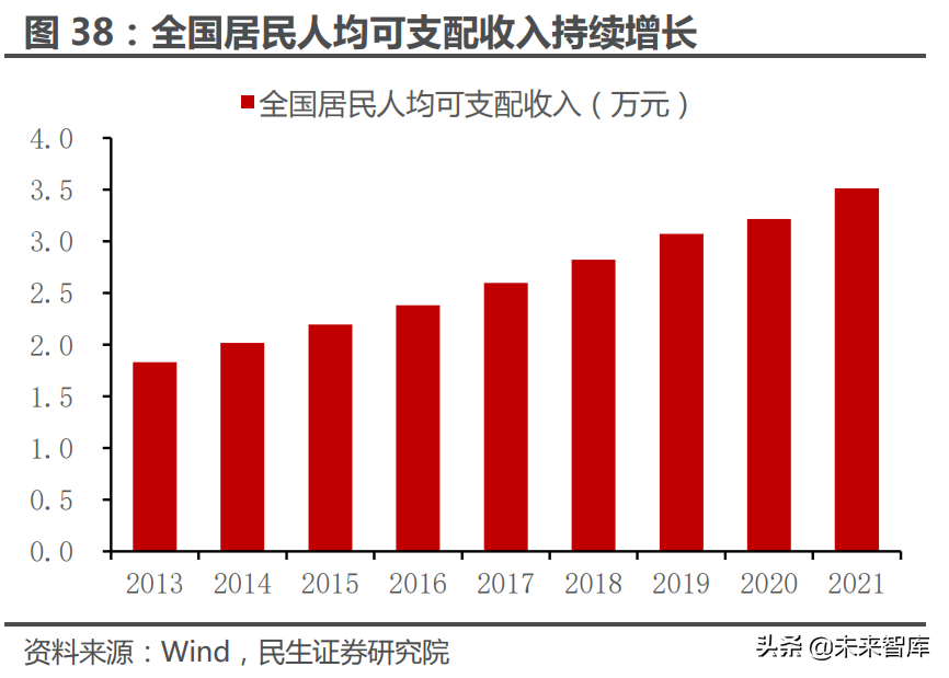 与发达地区相比,我国人均珠宝消费额偏低,中长期提升空间充足。据金投珠 宝数据,2019 年内地人均珠宝消费额为 69 美元,同期中国香港和美国则分别为 787 美元与 223 美元,分别是内地的 11.5 与 3.2 倍,与发达地区相比,内地人均 珠宝消费额仍有较大提升空间。上文已经提到,珠宝作为可选属性极强的消费品, 其规模与人均可支配收入水平高度相关,据 Wind 数据,2013-2021 年内地人均 可支配收入由 1.83 万元增长至 3.51 万元,成为珠宝行业扩容的核心动力之一; 同时,近年来内地中产阶级人口规模有所扩大,据头豹研究院数据,2012-2018 年 内地中产阶级人口占比由 68%提升至 77%,这也成为拉动内地珠宝需求持续增长 的因素之一。综上,我们认为未来随着我国居民人均收入水平提高,特别是中高收 入人群规模扩大,珠宝行业的市场空间将继续稳步增长。