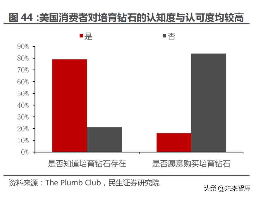 美国市场已经充分打开,国内培育钻石市场潜在空间可观。根据 The Plumb Club 在 2021 年的调研数据,约 79%的美国消费者对培育钻石的存在已经有所认 知,约 16%的美国消费者愿意购买培育钻石,说明培育钻石在美国的接受度已经 达到一定水平;对比之下,国内培育钻石市场目前尚处于初级阶段,无论是认知度 与认可度均处于较低水平,需要品牌商继续推进消费者教育。国内消费者对培育钻石的潜在接受度是比较高 的,约 68%的国内消费者认可培育钻石是真钻石,并且约 81%的消费者愿意在“看 起来一样”的情况下接受培育钻石。考虑到培育钻石的性价比优势,以及我国近年 来持续上行的婚恋成本,叠加”悦己”消费的逐步升温,培育钻石在国内市场的前 景比较乐观,有望为我国珠宝市场贡献新的增量。(报告来源:未来智库)