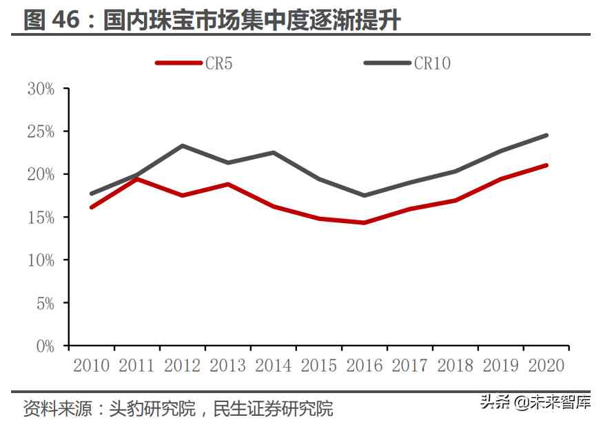 近年来国内珠宝行业集中度逐年上行,但理论提升空间仍然显著。据头豹研究 院数据,2016 年以来,我国珠宝行业 CR5 由 14.3%提升至 21.0%,CR10 由 17.5% 提升至 24.5%,行业集中度持续上行;但是,横向对比之下能够发现集中度提升 空间仍大,据欧睿数据,2020 年中国香港珠宝行业 CR10 达到 56%,日本达到 49%,虽然美国仅有 9%,但考虑到居民的文化传统与消费习惯的差异性,中国香 港与日本市场或更有参考价值。从这一角度来看,国内珠宝市场集中度在理论上仍 有较大的提升空间,我们将在下文探讨行业集中度的提升路径。