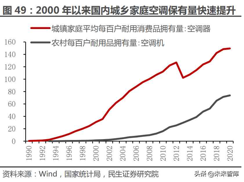 空调行业早期下沉市场需求广阔,产业矛盾主要存在于供给侧,渠道拓展是企 业快速发展的核心驱动力。我国家用空调行业发展开始于 20 世纪 80 年代中期, 从国家统计局公布的空调百户保有量数据来看,城镇市场渗透率提升速度快于农 村,我们认为主要有两方面原因,一是城乡居民的购买力水平存在差异,二是低线 城市包括农村渠道体系相对欠缺,需求无法被及时满足。从城镇化率水平来看,行 业早期大量人口居住于农村及低线城市,说明下沉市场存在规模庞大的需求红利, 而彼时空调厂商的渠道集中于一二线城市,激烈竞争之下市场格局比较分散,据美 的电器招股书,1992 年全国空调产量达到 300 万台,共有 80 余家生产企业,但 没有任何一家规模超过 40-50 万台。在这样的背景之下,通过渠道拓展向低线城 市及农村拓展成为企业快速成长的关键所在,这与我国珠宝行业现阶段通过加盟 形式向低线市场进行下沉存在异曲同工之处。