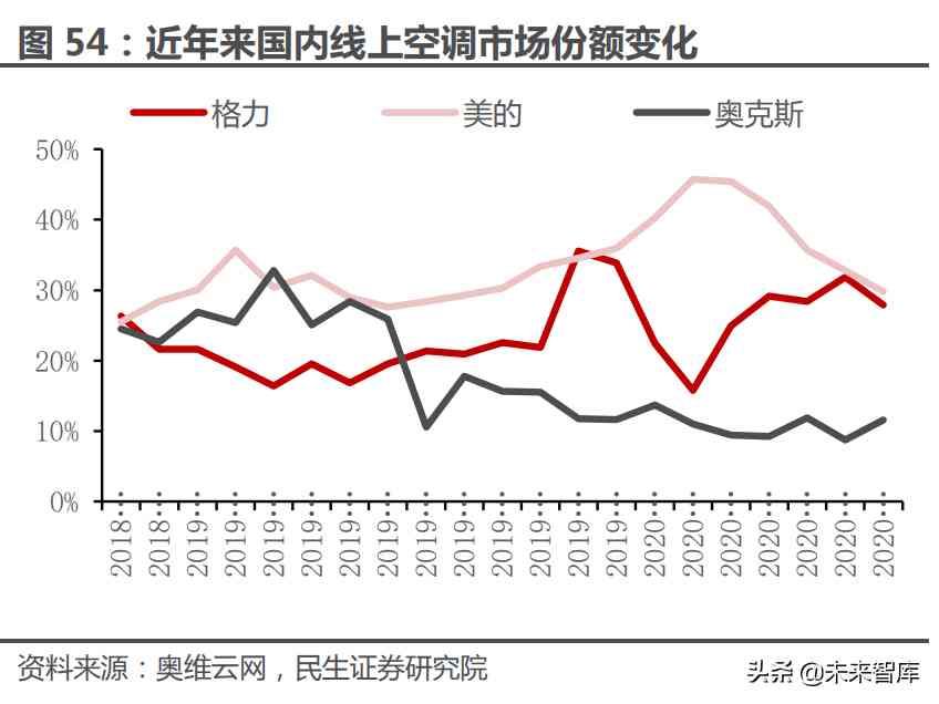 空调龙头在渠道扩张收割低线市场红利阶段沉淀的品牌优势帮助其更从容的 应对渠道变革冲击,并逐步获得产品溢价能力。空调行业在电商崛起之后迎来渠道 变革冲击,奥克斯等长尾品牌在线上渠道的市占率一度超过美的与格力,但是这种 借助时间差而非品牌力获取的市场份额难以长期维持,龙头积极布局线上渠道之 后其市占率便大幅下降。而且,在这一过程中,随着消费者对龙头公司品牌力认可 度提升,美的与格力空调产品的盈利能力也呈现出长期走强的趋势。