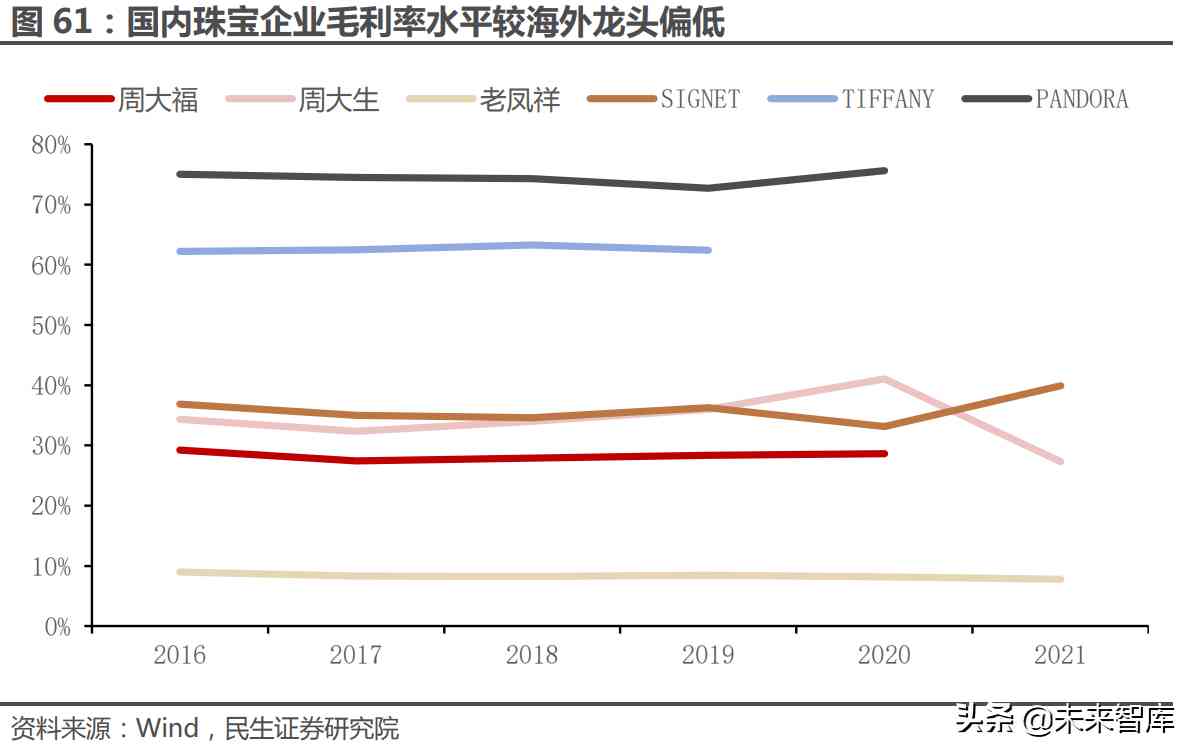 珠宝龙头后续若实现渠道红利向品牌红利转化,长期盈利能力仍将有进一步 上行空间。据 Wind 数据,目前国内的珠宝企业如周大福、周大生和老凤祥等与海 外龙头相比,产品附加值较低,盈利能力相对偏弱,差距或主要在于品牌力。我们 认为,后续随国内珠宝龙头逐步将低线市场的渠道红利转化为品牌红利,不断提升 品牌的文化内涵,从而实现盈利能力的进一步提升。(报告来源:未来智库)