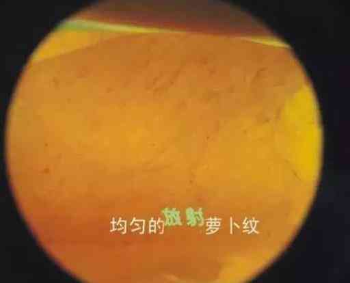 我们根据田黄石中萝卜丝纹的形态,将其分类为:放射状、网格、牛毛、絮状、水流、米粥等主要的六种,其中絮状萝卜纹占了多数。