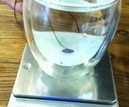 将翡翠与丝线连接,在精密电子天平上放置一杯清水,清零;将翡翠放在杯中,记下重量;用丝线提起翡翠,不超过水面,但始终远离杯子底部,再次记录重量。