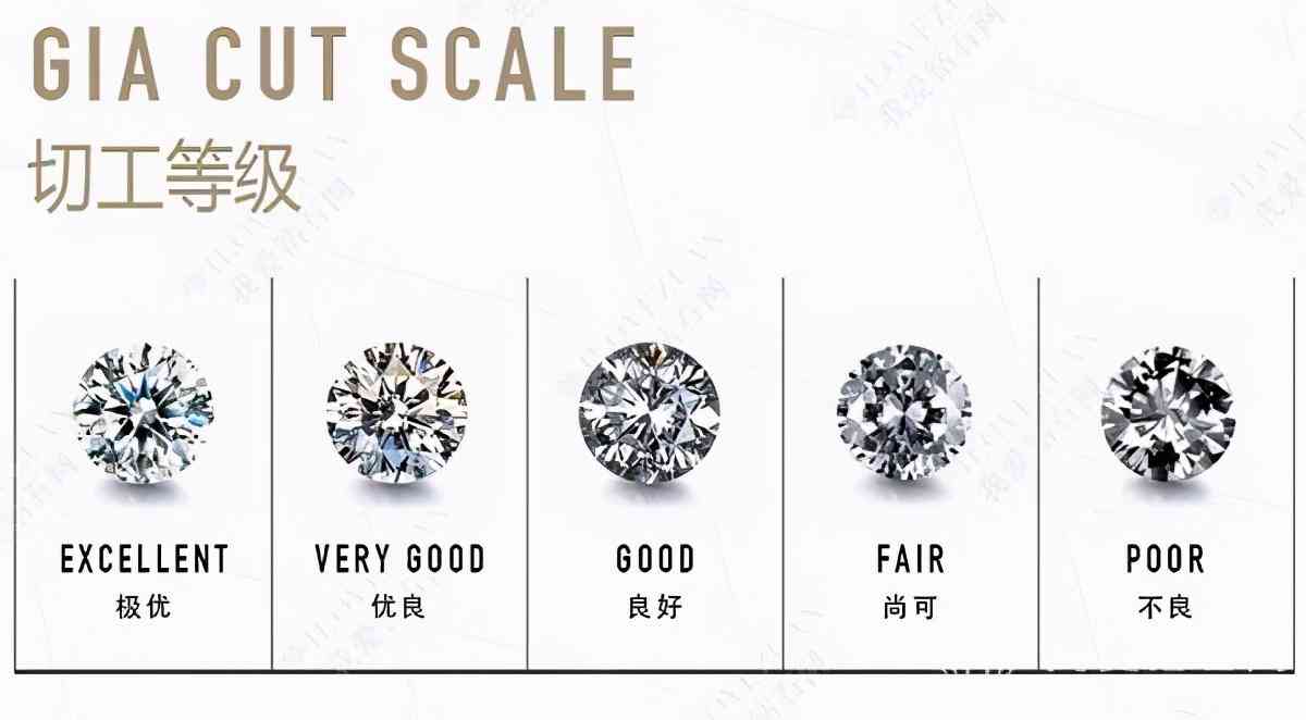 理想切工(EXCELLENT):只有3%的钻石可达到此标准。这种切工几乎能将所有进入钻石的光线完美反射出来,让钻石无比璀璨。非常好切工(VERY GOOD):可以使钻石反射出和标准等级切工的光芒,发挥出钻石的完美火彩。好切工(GOOD):钻石反射了大部分进入钻石内部的光,可以将进入钻石内部的大部分光线很好的反射出来一般切工(FAIR):在钻石切工的范畴里,这类切工的钻石属于合格。差切工(POOR):这些钻石的切工要么深而窄,要么浅而宽,容易让光线从边部或底部逸出,使钻石失去光彩。