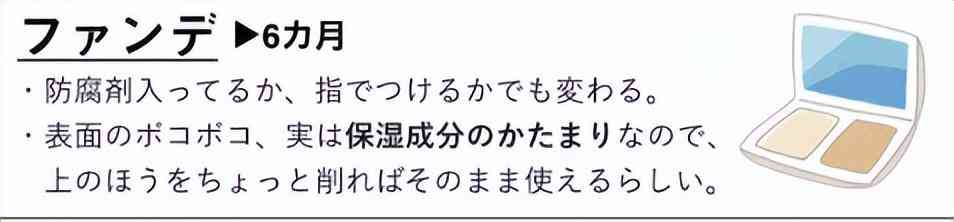 粉底:(这里指粉饼)保质期一般在六个月左右,但有时表面会结块,所以可以把上面刮一刮再用。