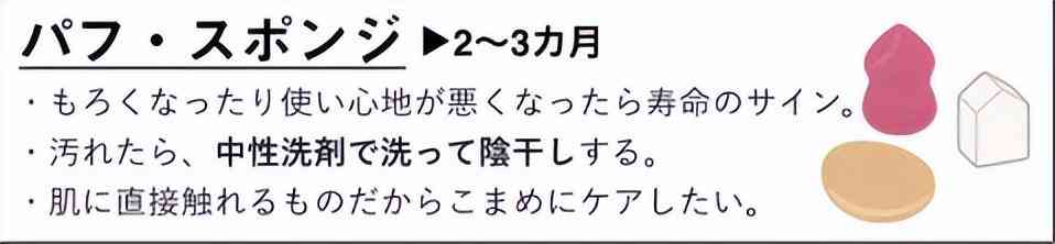 美妆蛋、粉扑:一般使用寿命在2~3个月,但个人可以根据使用感受判断是否需要更换。如果脏了建议用中性洗涤液清洗,因为是和皮肤直接接触的,所以要勤洗勤换。