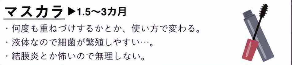 睫毛膏:一般开封后1个半月~3个月过期。因为是液态的东西,所以容易滋生细菌,如果过期使用的话可能会引起结膜炎。