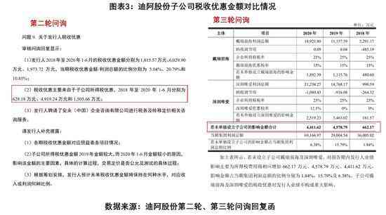 但在第三轮问询回复函中,迪阿股份在模拟测算上述两家子公司2018—2020年的税收优惠对其业绩影响的时候,税收优惠金额分别为662.17万元、4578.79万元、4411.62万元,占迪阿股份利润总额的1.84%、15.79%、6.38%,其中2019年的金额与第二轮问询存在明显出入,占比相比第二轮问询(20.79%)也显著降低,疑似被人为调整,以减轻对母公司的业绩影响程度。