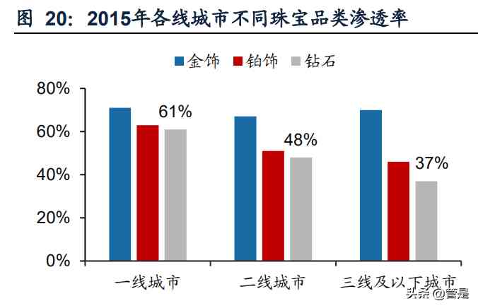 中国钻饰市场较欧美起步晚,虽然近年来快速发展,但渗透率仍有较大提升空 间。根据Bloomberg数据,2020年中国钻饰市场规模1223亿元,占全球份额仅13%, 远低于美国的51%。中国珠宝消费目前仍以黄金品类为主,2019年黄金饰品在中国 珠宝首饰消费中占比为53%,钻石饰品占比仅为20%。不同层级的城市数据显示, 钻石饰品渗透率均低于金饰与铂饰,同时三线及以下城市钻饰渗透率仅37%,远低 于一线(61%)和二线(48%),这意味着钻饰在中国的渗透率仍有很大提升空间。