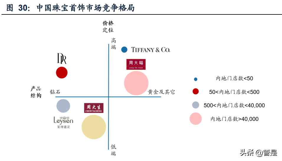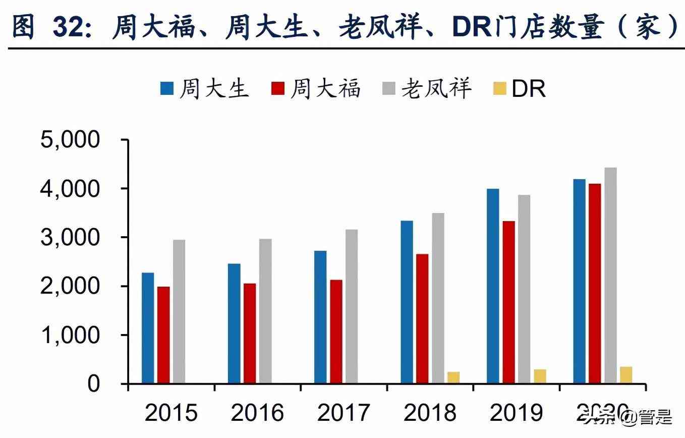 而在大众市场,钻戒产品同质化严重,深圳水贝发达的供应链生产能力,使得 主要的港资和内地品牌均采用委托加工的生产模式,即使打造出设计爆款,也会被 快速模仿追随,导致产品之间的差异不明显。因此渠道扩张和管理能力,是龙头品 牌过去最大的成功驱动力。截至2020年末,国内排名前三的周大福、老凤祥、周大 生在内地的门店数均超过4000家,因此我们认为行业新进入者单纯依靠门店扩张的 成长路径难度很大,如何能通过产品或是理念的创新塑造品牌辨识度,才是实现突 围的最优路径,而我们这篇报告的主角DR正是这样做的。