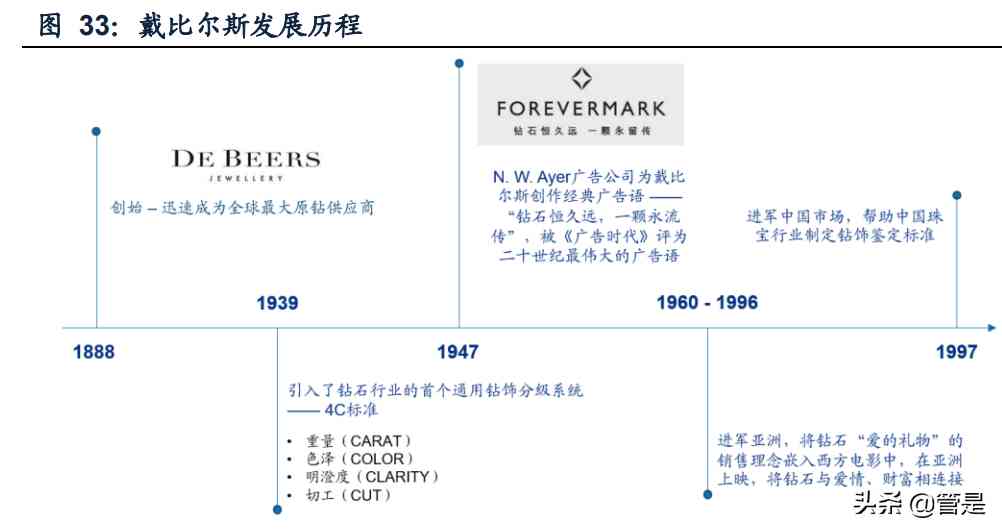 戴比尔斯1947年打出“A diamond is forever”这句世人皆知的广告语,进入 中国市场后又被翻译为“钻石恒久远,一颗永流传”,经过几十年的消费者教育, 坚硬的钻石象征忠贞不渝的爱情这一理念已深入人心。戴比尔斯结合消费者特征偏 好、购买心理及动机,从感性与理性层面制定长期营销战略,树立钻石情感形象。 感性层面,戴比尔斯抓住钻石“美好+永恒”的特质,与消费者理想的忠贞不渝的爱 情观相结合,强化钻石与美好爱情的联系。同时通过“钻石恒久远,一颗永流传” 等广告的大量投放,成功打造钻石文化,将钻石塑造为经典求婚、订婚礼物。理性 层面,戴比尔斯配合1997年颁布的国家钻石分级标准,通过店铺宣传材料、公众媒 体等渠道向消费者介绍钻石历史及4C评价标准、购买技巧等基本知识,改变了钻石 在消费者心中“遥不可及的舶来品”的形象,进一步为钻石普及打下基础。