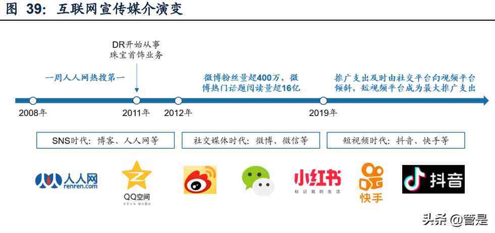 我们认为DR具备极强的互联网营销能力,体现为紧跟年轻用户的社交媒介演变, 丰富的内容创作输出,以及精细化的粉丝运营管理,而2020年爆发的短视频媒介相 比图文时代更具传递情感的能力,加速品牌理念的传播推广。从2010年的社区论坛 (人人网等),到2012年持续迭代的社交网络(微博、微信、小红书等),再到2019 年兴起的短视频媒介(抖音、快手等),DR全域布局年轻用户活跃的各个媒介平台, 但同时也随着用户社交语言的进化而加大新流量媒介的投入。
