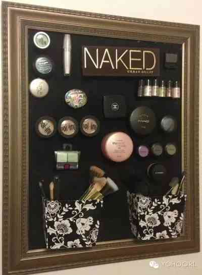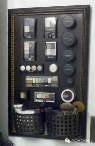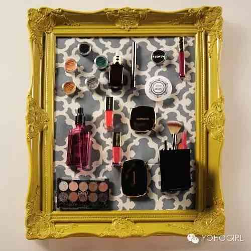 准备一个画框,画面部分用铁板封好,再贴一层喜欢的壁纸。接下来,在常用的化妆品背面都粘上一个磁片,将它们吸在画框上,每天化妆时都感觉艺术气息扑面而来!