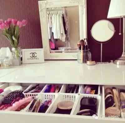 把抽屉按照自己的习惯分好格子,这样,盛放化妆品的时候就不会乱糟糟的了。