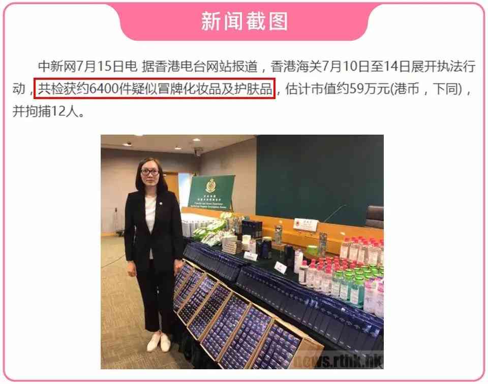 今年 7 月 15 日,被誉为化妆品购物天堂的香港就被爆出,检获约 6400件 疑似冒牌化妆品及护肤品。产品包括化妆水、面霜及防晒乳液等,涉案店铺集中在旅游点,受害消费者或多为游客。