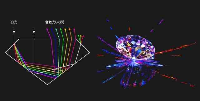 光线在钻石内的全反射临界角为24°26′,要消除钻石内漏光区域,必须通过对钻石亭部和冠部切割比例、角度和切割面数量、形状、大小完美测算,再通过最精湛的工艺才能将射入的光线实现全部反射,达到钻石火彩的最佳效果。