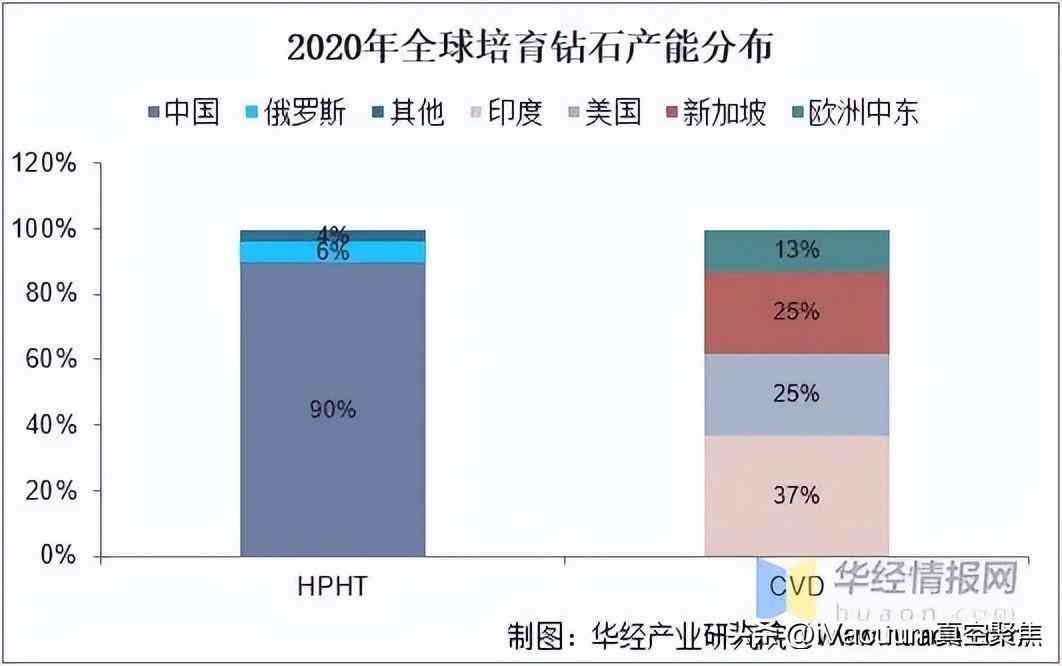 根据贝恩数据显示,2020年全球高温高压技术生产的培育钻石中,有90%来自中国,俄罗斯产能占6%,中国几乎垄断了全球HPHT钻石的产能;CVD钻石生产产能分布较均匀,印度、美国、新加坡、欧洲中东分别占37%、25%、25%、13%。