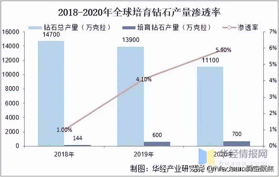 2018年全球培育钻石产量为144万克拉,渗透率仅为1%,由于疫情影响和天然钻石原料紧缺等因素影响,全球钻石总产量减少,为满足市场钻石消费需求,培育钻石产量增多,渗透率稳步上升,2019年和2020年培育钻石产量分别为600万克拉、700万克拉,渗透率达到4.1%、5.9%。