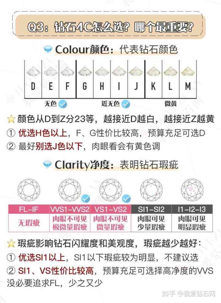 确定预算和选择范围后,就要根据4C和钻石各项参数来选一颗优质的钻石了,即使是买成品钻,也要通过4C看钻石优劣的,总结如下: