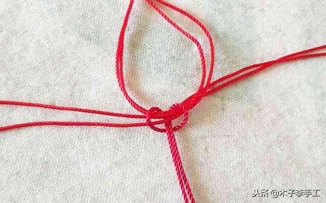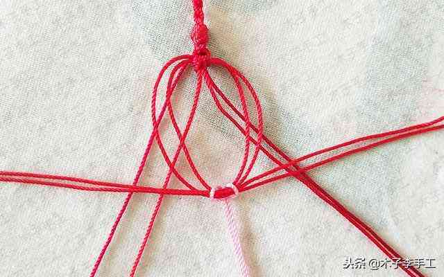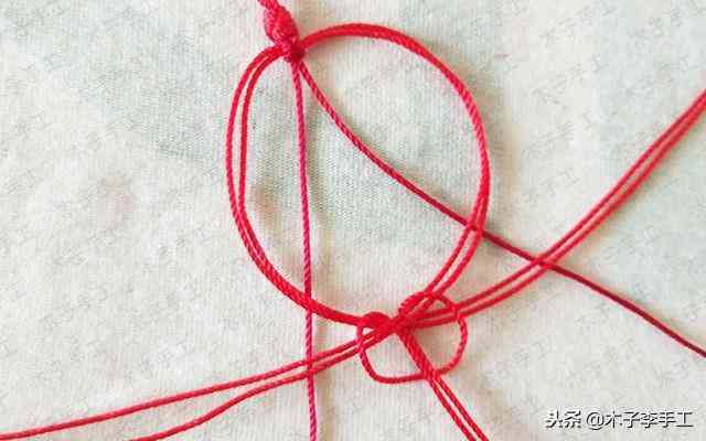 2、这4根线为轴线交叉打个圈,另取一根150cm的15股线对折后在圈上做一个雀头结