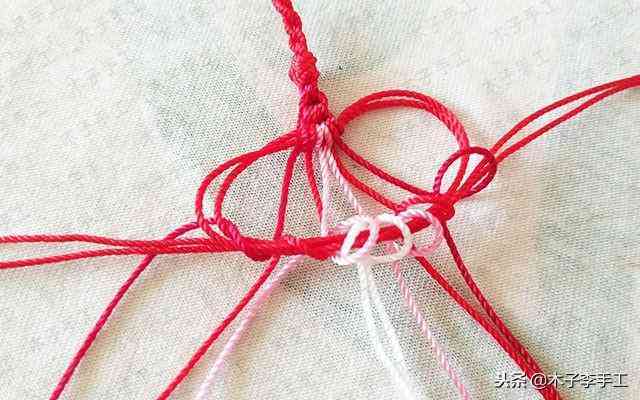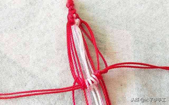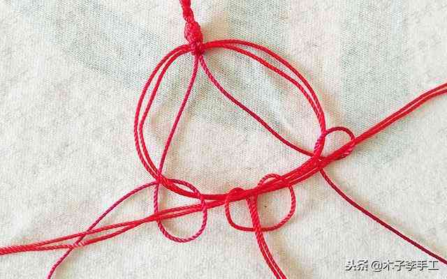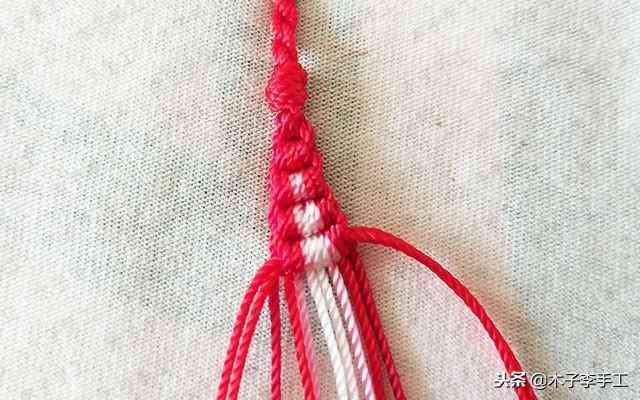 7、之前加的4根线也是在圈上分别做半个左斜卷结,打在新加的线的左右两边