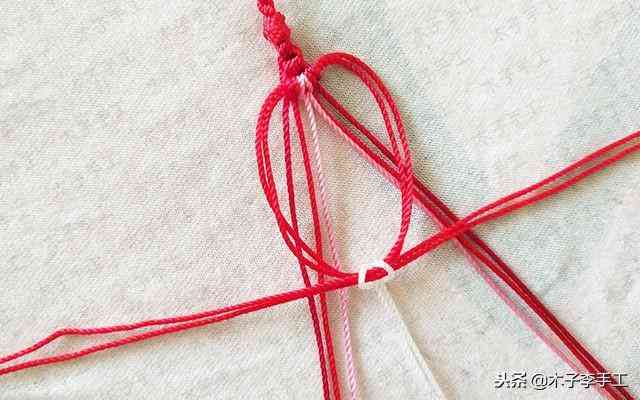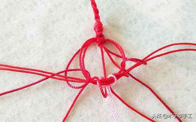 5、前面加的那2根线在圈上分别做半个左斜卷结,打在新加的线的左右两边